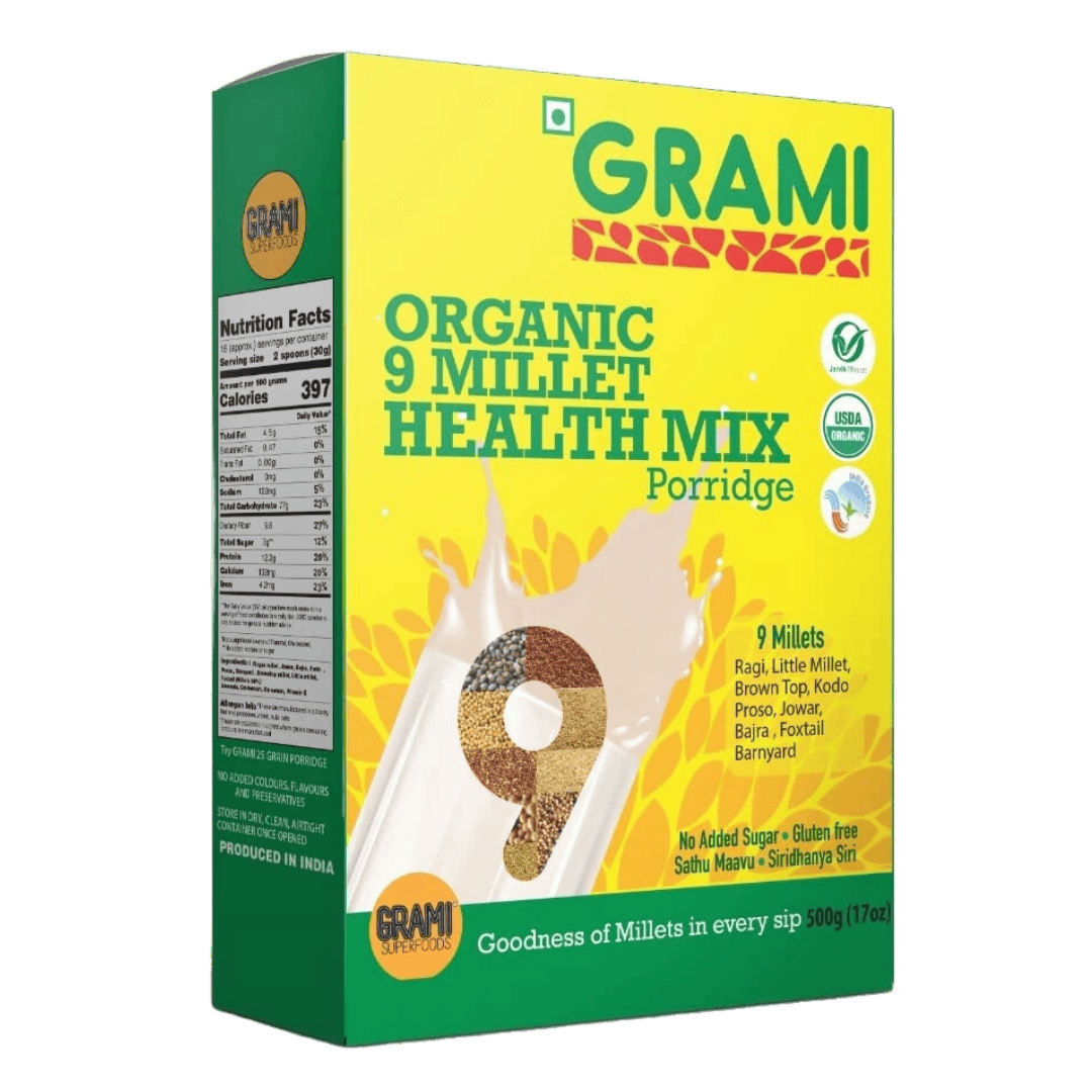 - Organic 9 Millet Healthy Porridge Drink made from Ragi, Little, Brown Top, Kodo, Proso, Jowar, Bajra, Foxtail, and Barnyard Millet.