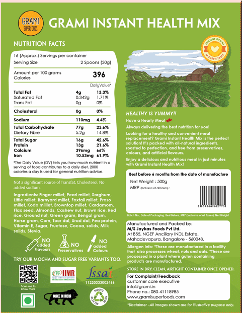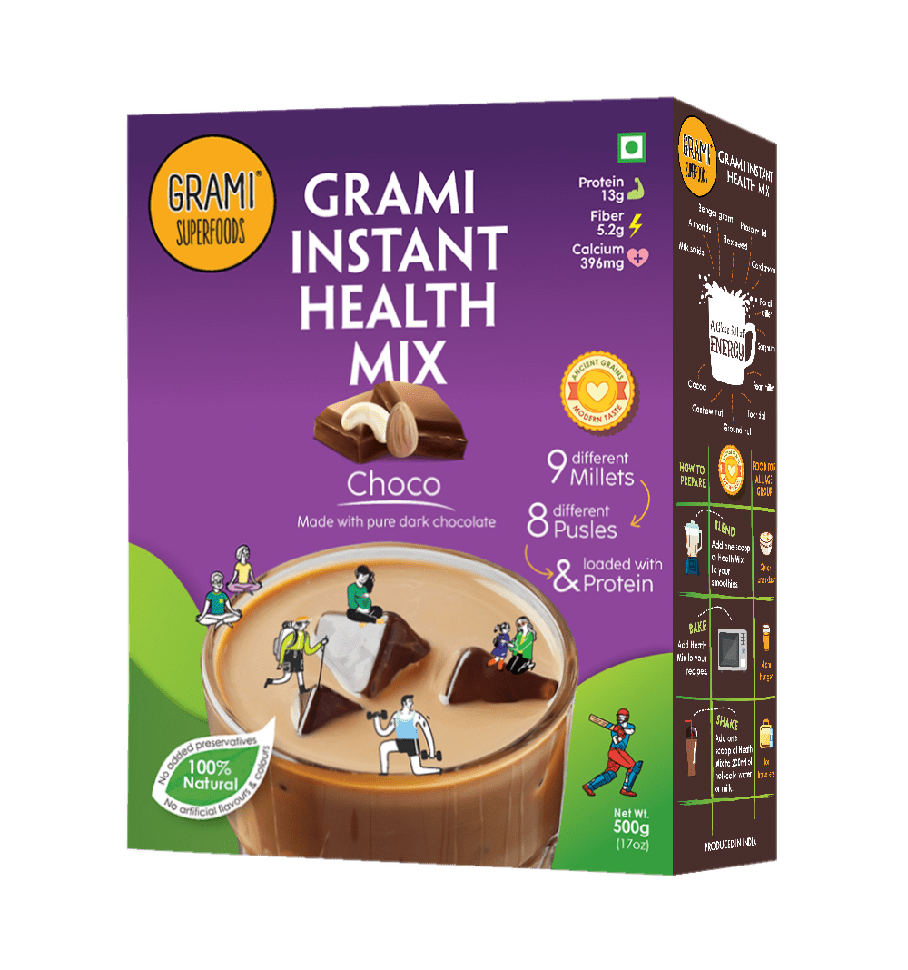 Grami Choco Instant Health Mix contains no sugar, preservatives, colors, or artificial flavors. All ingredients are roasted to perfection for better taste and nutrition. The combination of pulses, grains, and nuts ensures complete protein with all essential amino acids, making it a balanced meal or snack for the whole family.