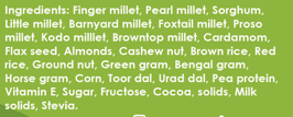 | Finger millet, Pearl millet, Sorghum, Little millet, Barnyard millet, Foxtail millet, Proso millet, Kodo millet, Browntop millet, Cardamom, Flax seed, Almonds, Cashew Nut, Brown Rice, Ground nut, Red Rice, Barley, Green Gram, Bengal Gram, Horse Gram, Corn, Toor Dal, Urad Dal, Pea protein, Vitamin E, Sucrose, Fructose, Cocoa solids, Milk Powder, Stevia. |