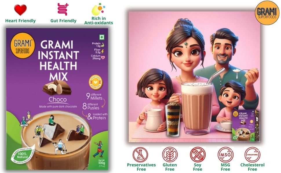 Grami Choco Instant Health Mix contains no sugar, preservatives, colors, or artificial flavors. All ingredients are roasted to perfection for better taste and nutrition. The combination of pulses, grains, and nuts ensures complete protein with all essential amino acids, making it a balanced meal or snack for the whole family.