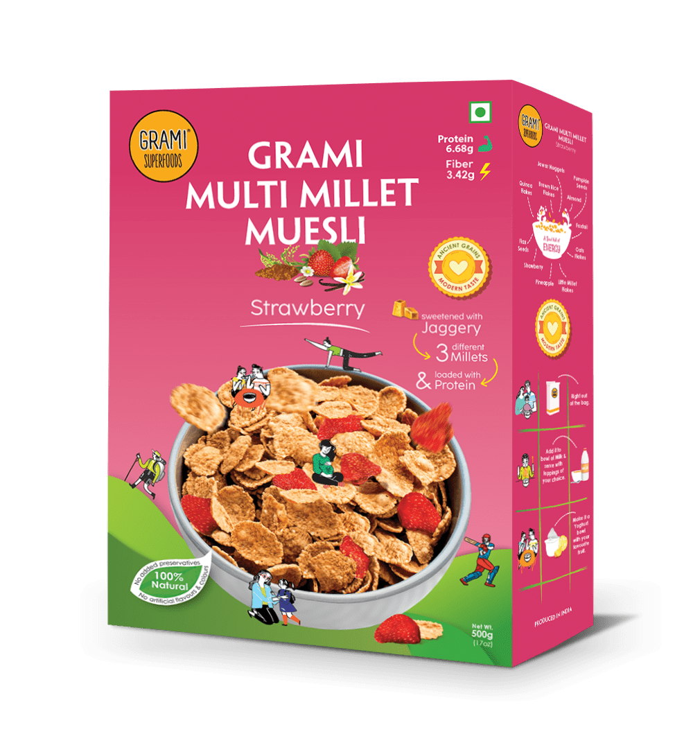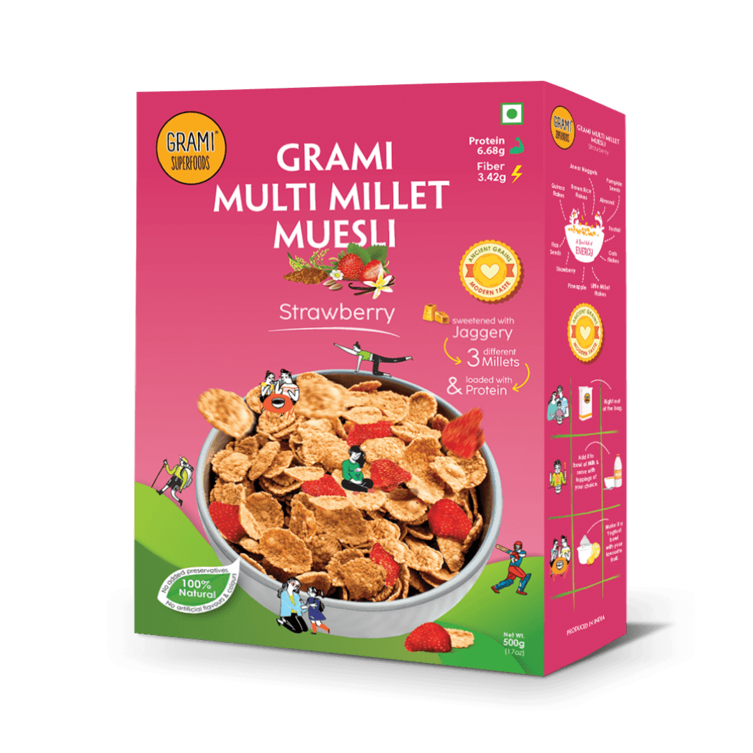 Strawberry muesli is a tasty, healthy, and convenient breakfast or snack. Choose this high protein, multi millet breakfast cereal to support your active lifestyle every day.