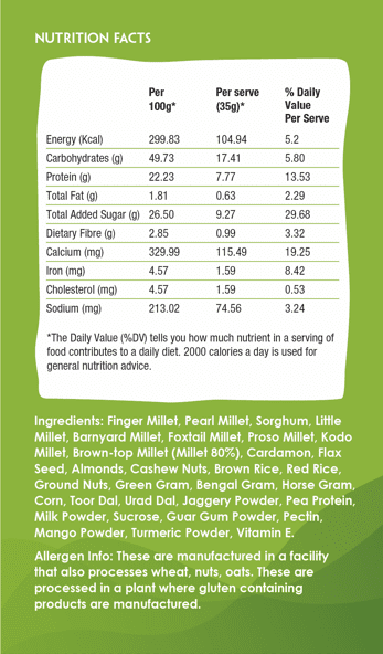 High protein & multigrain: Pea protein and millets for lasting energy.