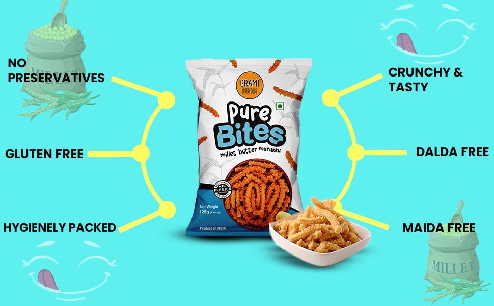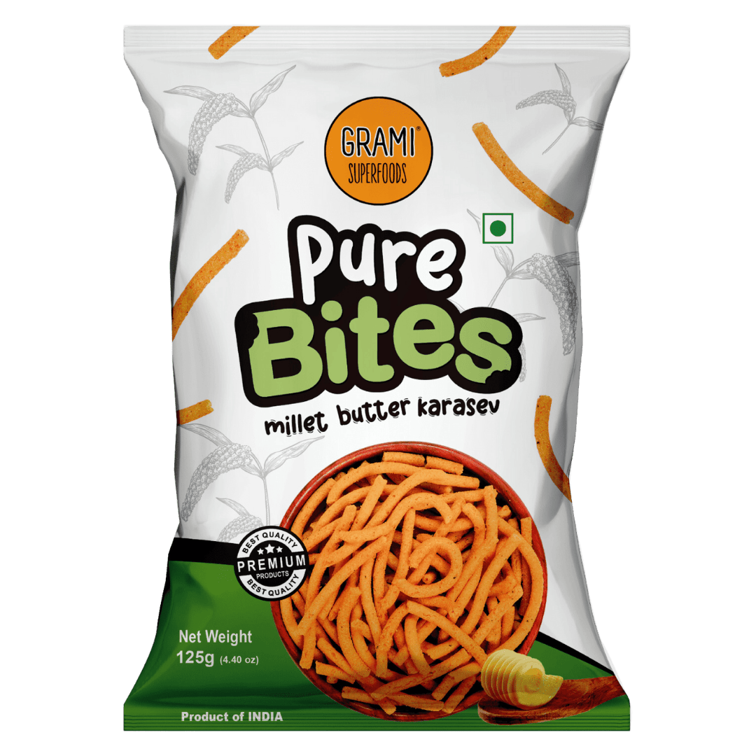 Pure Bites Millet Butter Karasev is a delicious, crunchy snack inspired by traditional South Indian recipes. Made with a blend of nutritious millet flour, gram flour, and a touch of real butter, this gluten-free snack is a healthier alternative to conventional fried snacks. Because it contains no maida and no artificial preservatives or colors, it’s a clean-label snack you can trust for your family.