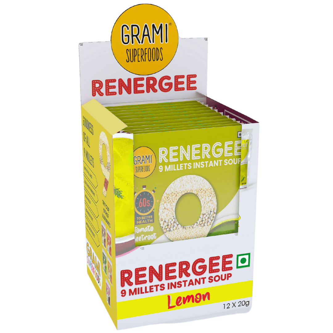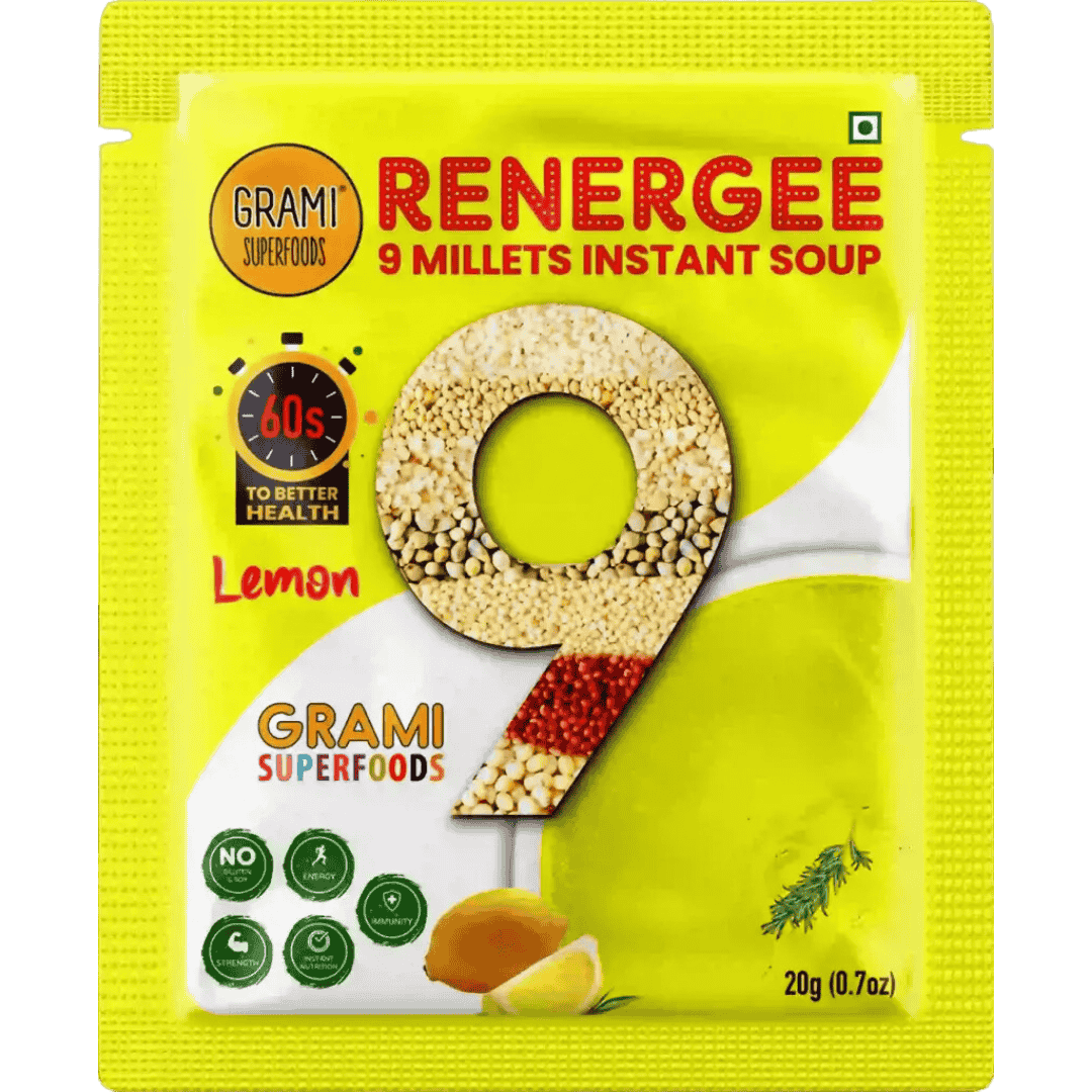 Renergee Instant 9 Millet Lemon Soup is a vegan, gluten-free soup crafted with 9 ancient millets and real lemon. This healthy soup delivers plant-based protein, essential vitamins, and fiber, making it perfect for heart health and gut wellness. Because it’s naturally gluten-free and contains no harmful preservatives, it’s safe for all dietary needs.
