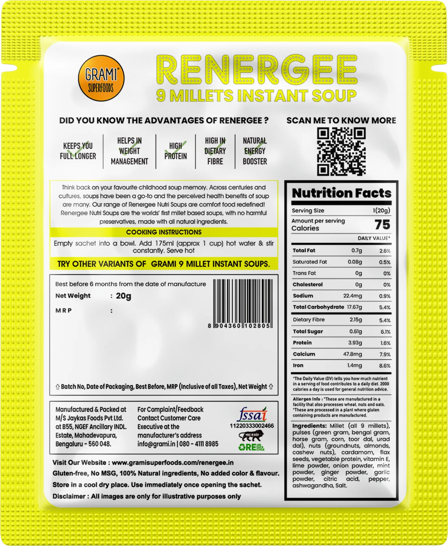 Just add hot water, stir, and savor a comforting, nutrient-rich bowl of Renergee Instant 9 Millet Lemon Soup. It’s ideal as a light lunch, snack, or dinner.