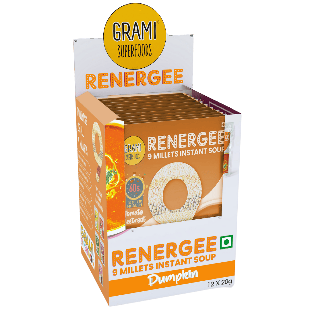 Renergee Instant 9 Millet Pumpkin Soup is a vegan, gluten-free soup crafted with 9 ancient millets and real pumpkin. This healthy soup delivers plant-based protein, essential vitamins, and fiber, making it perfect for heart health and gut wellness. Because it’s naturally gluten-free and contains no harmful preservatives, it’s safe for all dietary needs.