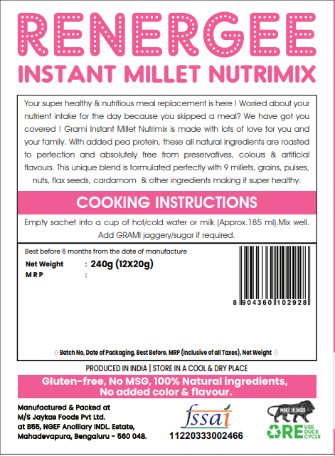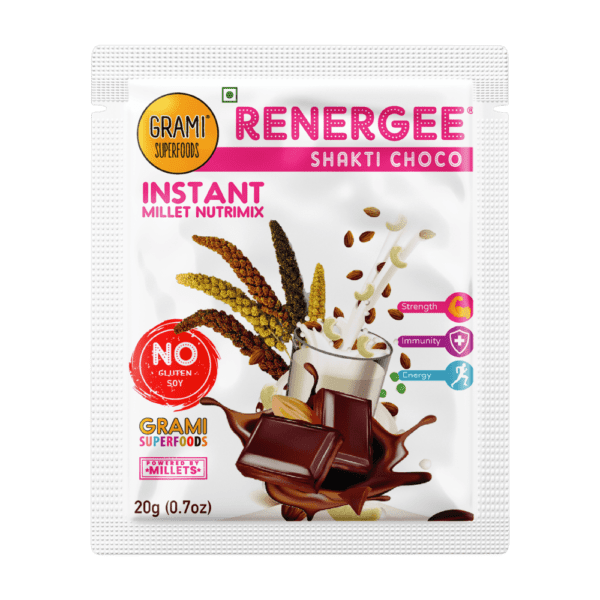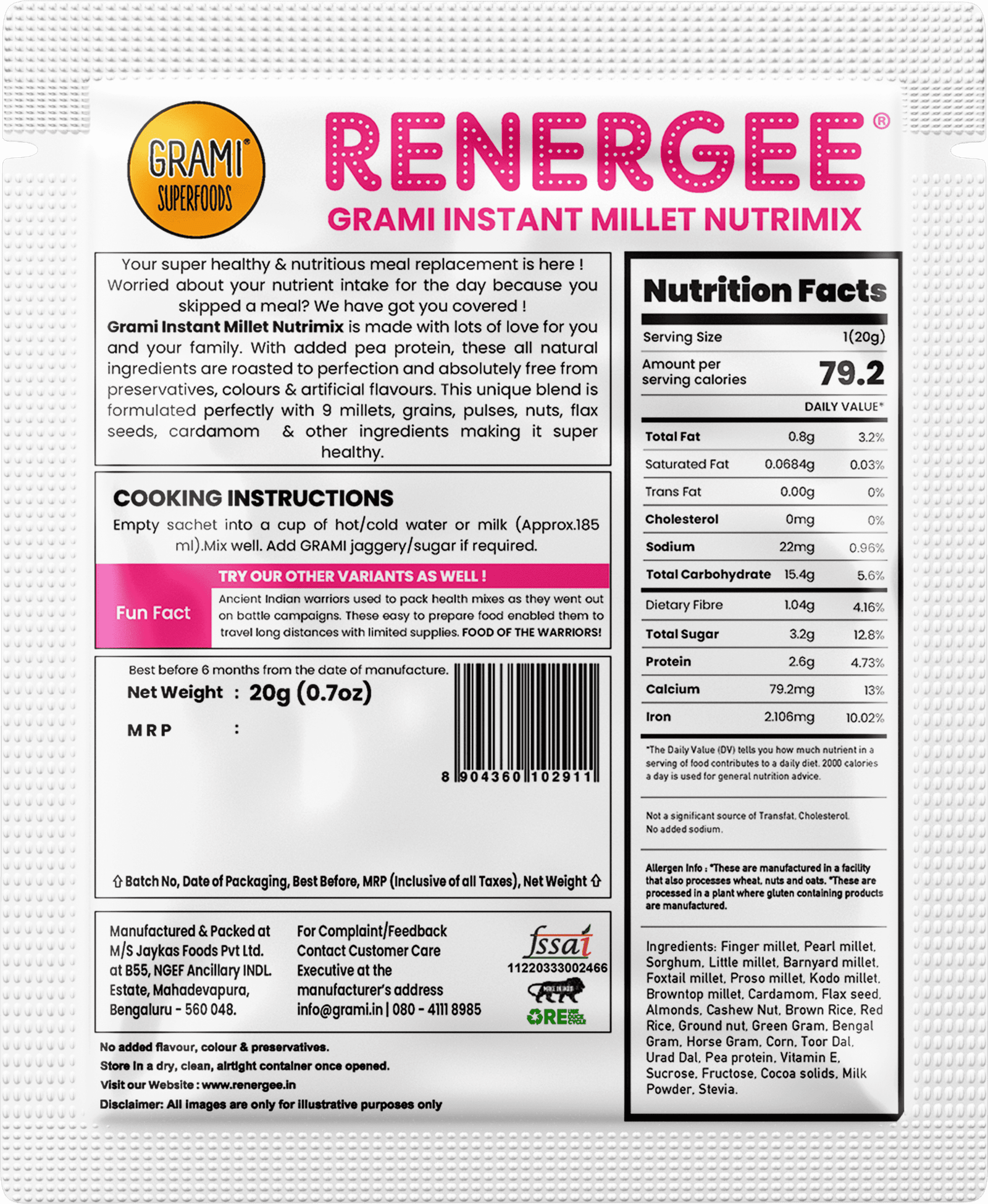 Renergee Instant Choco Nutrimix is a thoughtfully crafted, all-natural protein drink for you and your family. With added pea protein, this blend uses only natural ingredients, roasted to perfection. It is absolutely free from sugar, preservatives, colors, and artificial flavors. Each single-serve sachet offers a unique combination of nuts, grains, pulses, and flax seeds, making it a smart choice for daily nutrition.