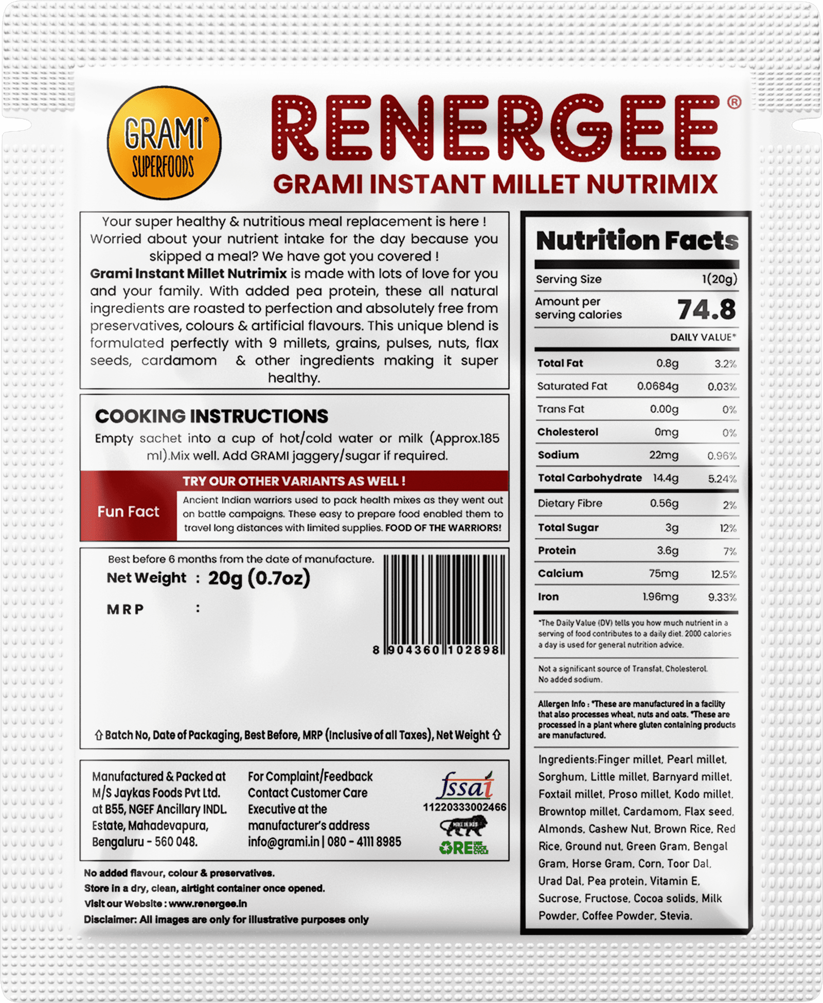 | Finger millet, Pearl millet, Sorghum, Little millet, Barnyard millet, Foxtail millet, Proso millet, Kodo millet, Browntop millet, Cardamom, Flax seed, Almonds, Cashew Nut, Brown Rice, Ground nut, Red Rice, Barley, Green Gram, Bengal Gram, Horse Gram, Corn, Toor Dal, Urad Dal, Pea protein, Vitamin E, Sucrose, Fructose, Cocoa solids, Milk Powder, Stevia |